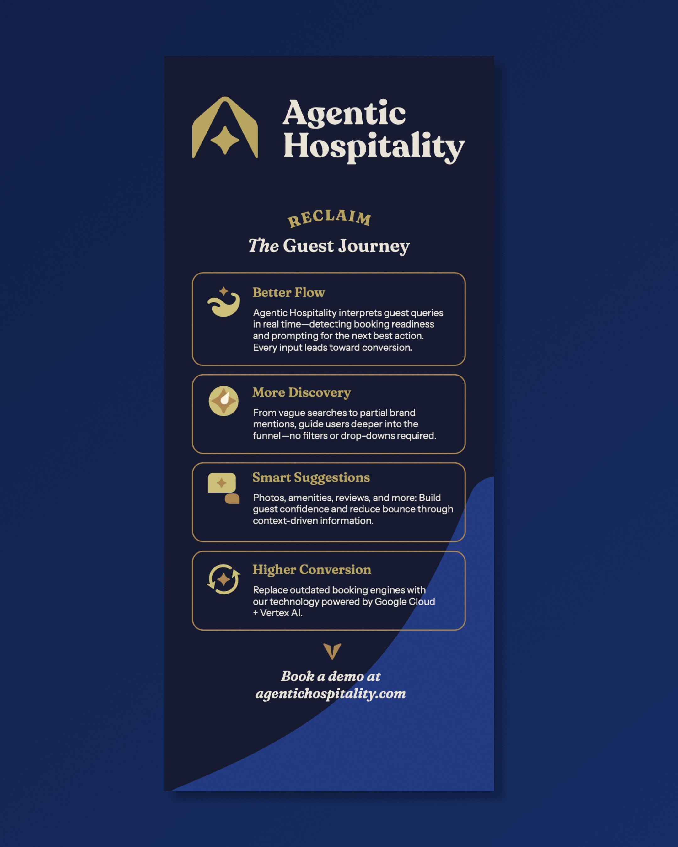 We brought Agentic Hospitality’s innovative brand to life through a style guide, video content, and a dynamic website, capturing their mission to empower hoteliers. To extend this, we designed print collateral and paid ad units that carried the platform’s sophistication into digital and real-world spaces. Unified by a cohesive identity, these assets reinforce Agentic’s leadership in AI-native travel technology, creating a memorable brand experience.